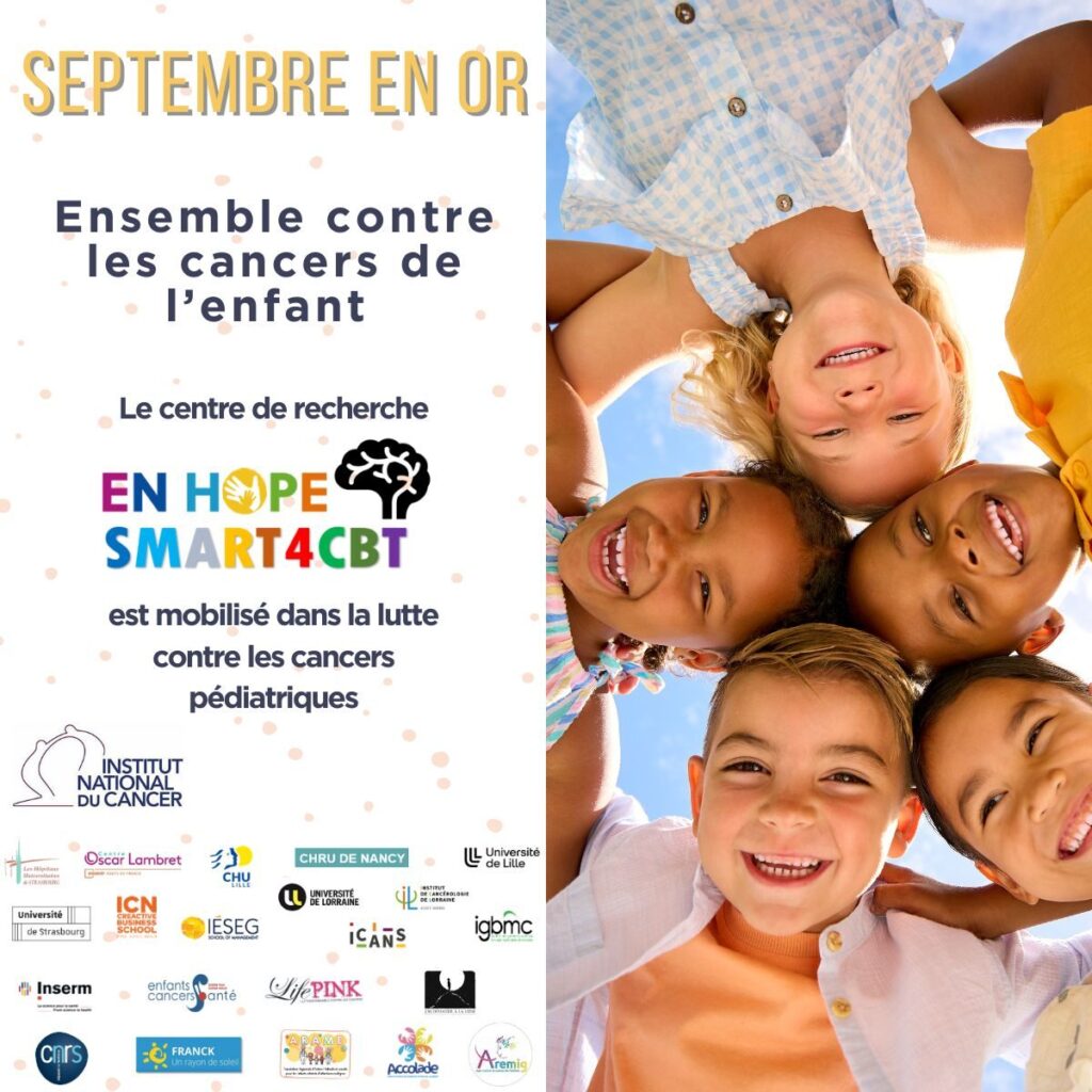 À l’occasion de la clôture de Septembre en Or, nous vous invitons à un temps d’échange autour des avancées en recherche sur les cancers pédiatriques. Ce webinaire réunira divers acteurs engagés – issus du monde de la recherche, du soin, de l’associatif, et des sciences humaines et sociales – pour croiser les regards et partager les pistes d’innovation, notamment autour des travaux du centre EN-HOPE SMART4CBT.